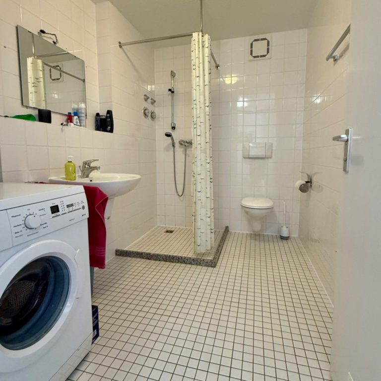 - Badezimmer raumhoch gefliest mit bodentiefer Dusche und Waschmaschinenanschluss